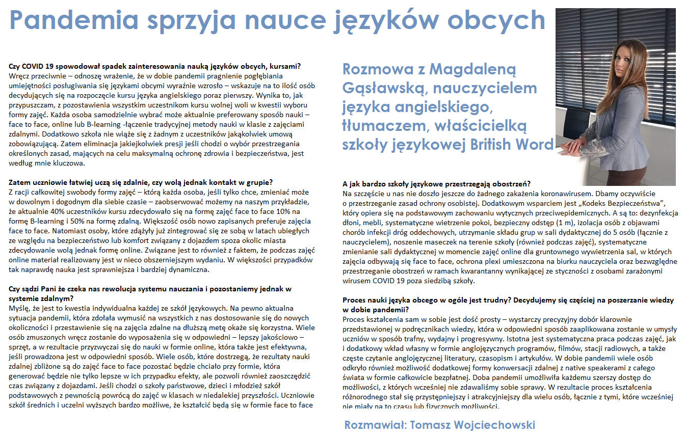 Wywiad Tomasza Wojciechowskiego redaktora naczelnego Bałtyckiego Portalu Informacyjnego z Magdaleną Gąsławską, właścicielką BRITISH WORD - z dnia 26 luty, 2021